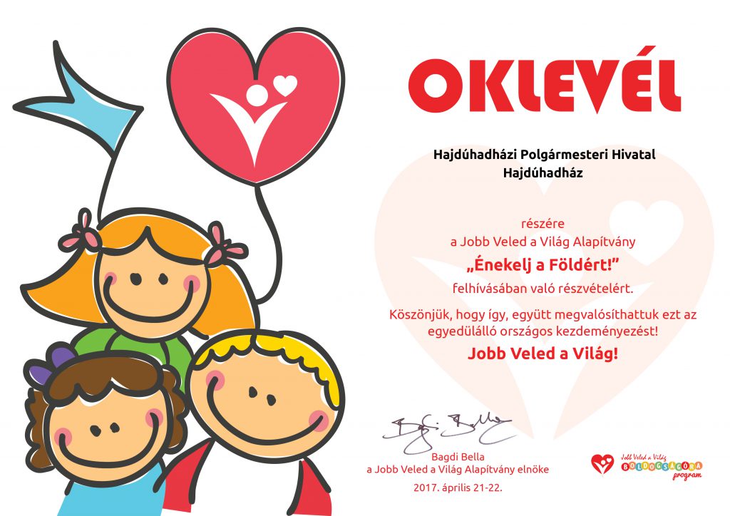 A Jobb Veled a Világ Alapítvány elismerő oklevele