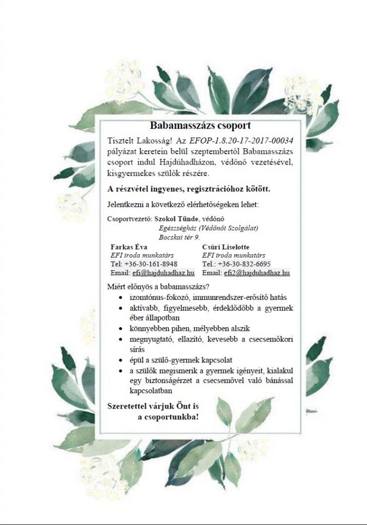Kisgyermekes szülők, figyelem! Babamasszázs csoport indul szeptembertől Hajdúhadházon. Ingyenes részvétel, egyszerű jelentkezés, érdekes téma, szakképzett csoportvezető.