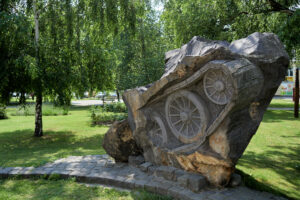 A lánctalpak mellett feltépett bazaltkockák ’56-os őseink hősi próbálkozására utalnak. A ma nemzedéke ezekre helyezheti el a jövőben az emlékezés gyertyáit. Az andezitből készített emlékmű faragott méretei: 2m x l,5m x 0,55m.