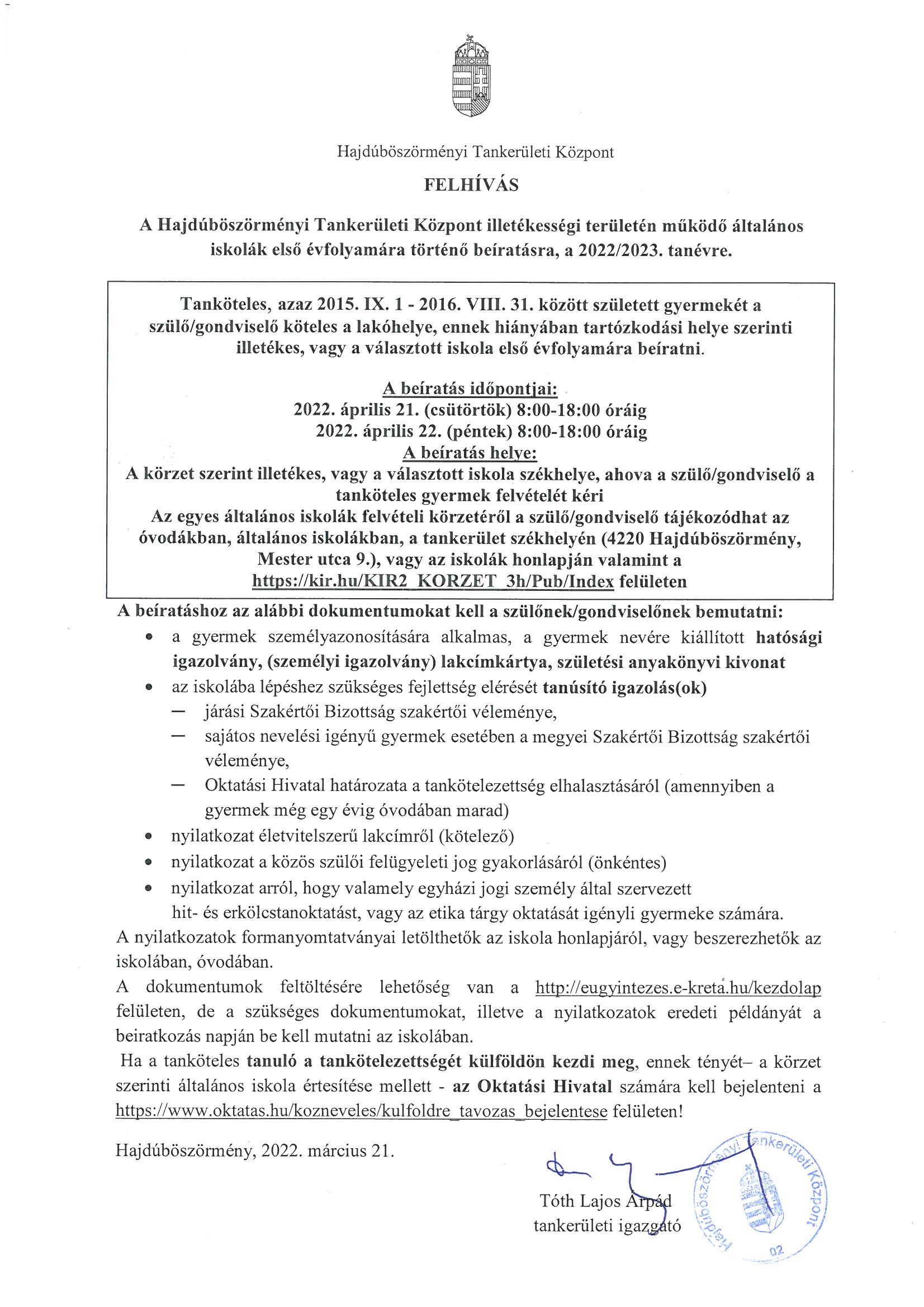 Életv.lakcím nyilatkozat_ 2022Nyilatkozat hit -és erkölcstan oktatásban való részvételről_2022Tájékoztató e- ügyintézésről_beíratkozásról_2022Törvényes képviselő nyilatkozat_2022 Hirdetmény Közérthető rövid összefoglaló