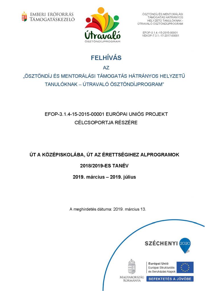 Felhívás – Útravaló ösztöndíjprogramra -EFOP-3.1.4-15-2015-00001