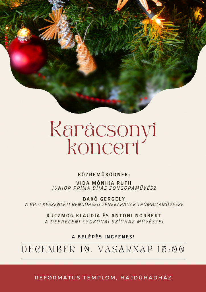 A Hajdúhadházi Református Egyházközség szeretettel meghívja Önt és kedves családját december 19-én, Karácsonyi Koncertjére.
