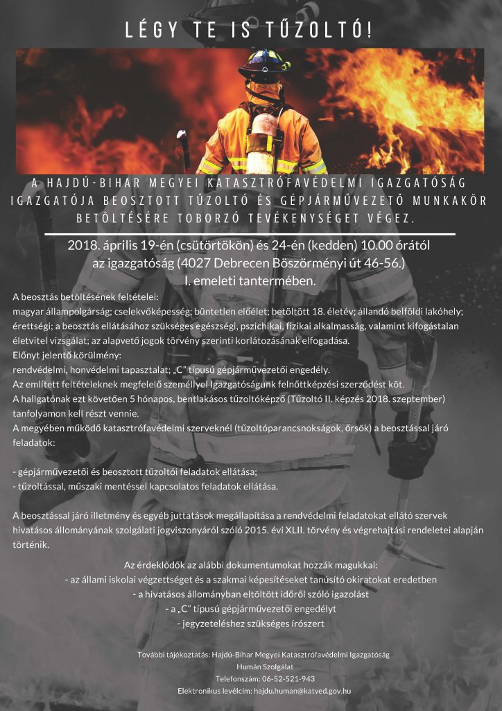 A Hajdú-Bihar Megyei Katasztrófavédelmi Igazgatóság Igazgatója beosztott tűzoltó és gépjárművezető munkakör betöltésére toborzást tart, 2018. április 19-én (csütörtökön) és 24-én (kedden) 10.00 órától az igazgatóság (4027 Debrecen Böszörményi út 46-56.) I. emeleti tantermében.