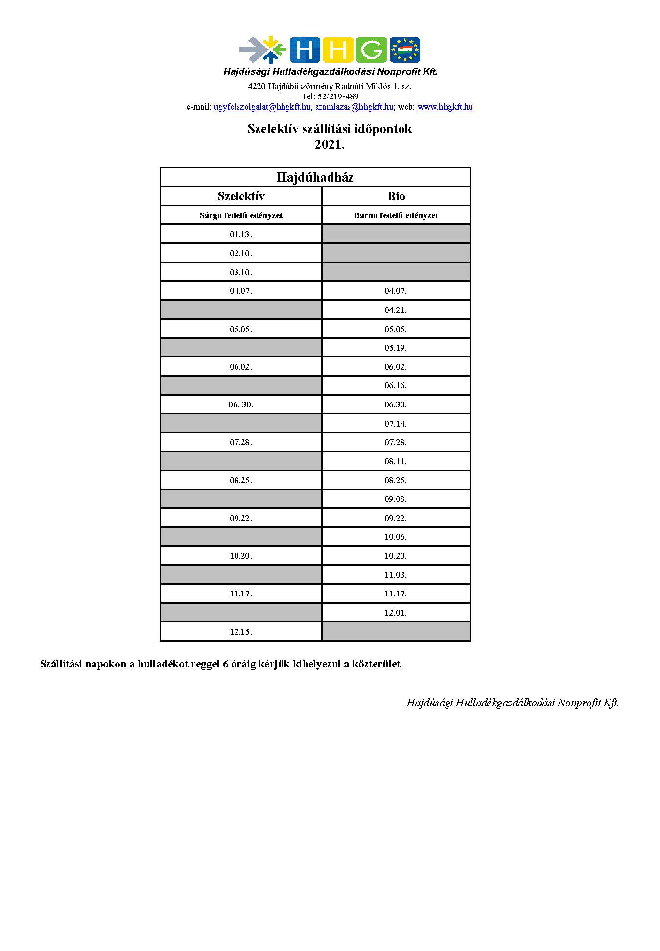 Szelektív szállítási időpontok 2021.