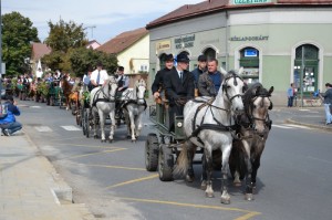 Délben kezdtek el gyülekezni a szüreti felvonulás résztvevői a Vásártéren, ahol idén több mint 20 feldíszített fogat vett részt, mintegy tízen pedig lóháton csatlakoztak a menethez, köztük Csáfordi Dénes polgármester is. A fogatokon helyet foglaltak a hajdúhadházi kertbarátkör meghívott vendégei is, a kabai, a téglási és a földesi kertbarátkör képviselői. Az induláskor a hintók álltak előre, ahol helyet foglaltak díszvendégeink, Tasó László országgyűlési képviselő, Czibere Béla, Téglás polgármestere, Nyíri Béla, Nyírábrány polgármestere, és Dr. Vincze István rendőr alezredes, rendőrkapitány.