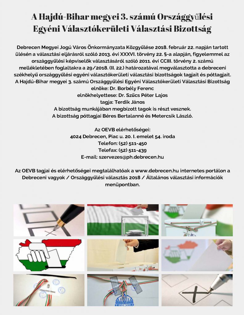Debrecen Megyei Jogú Város Önkormányzata Közgyűlése 2018. február 22. napján tartott ülésén a választási eljárásról szóló 2013. évi XXXVI. törvény 22. §-a alapján, figyelemmel az országgyűlési képviselők választásáról szóló 2011. évi CCIII. törvény 2. számú mellékletében foglaltakra a 29/2018. (II. 22.) határozatával megválasztotta a debreceni székhelyű országgyűlési egyéni választókerületi választási bizottságok tagjait és póttagjait.