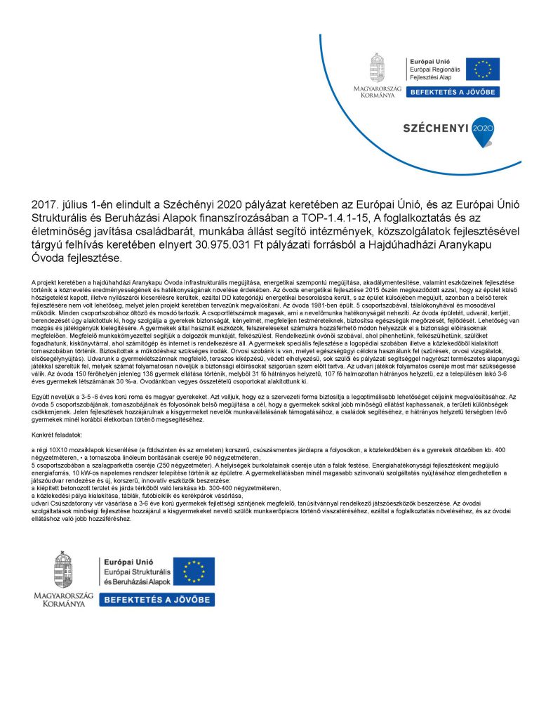 2017. július 1-én elindult a Széchényi 2020 pályázat keretében az Európai Únió, és az Európai Únió Strukturális és Beruházási Alapok finanszírozásában a TOP-1.4.1-15, A foglalkoztatás és az életminőség javítása családbarát, munkába állást segítő intézmények, közszolgálatok fejlesztésével tárgyú felhívás keretében elnyert 30.975.031 Ft pályázati forrásból a Hajdúhadházi Aranykapu Óvoda fejlesztése.