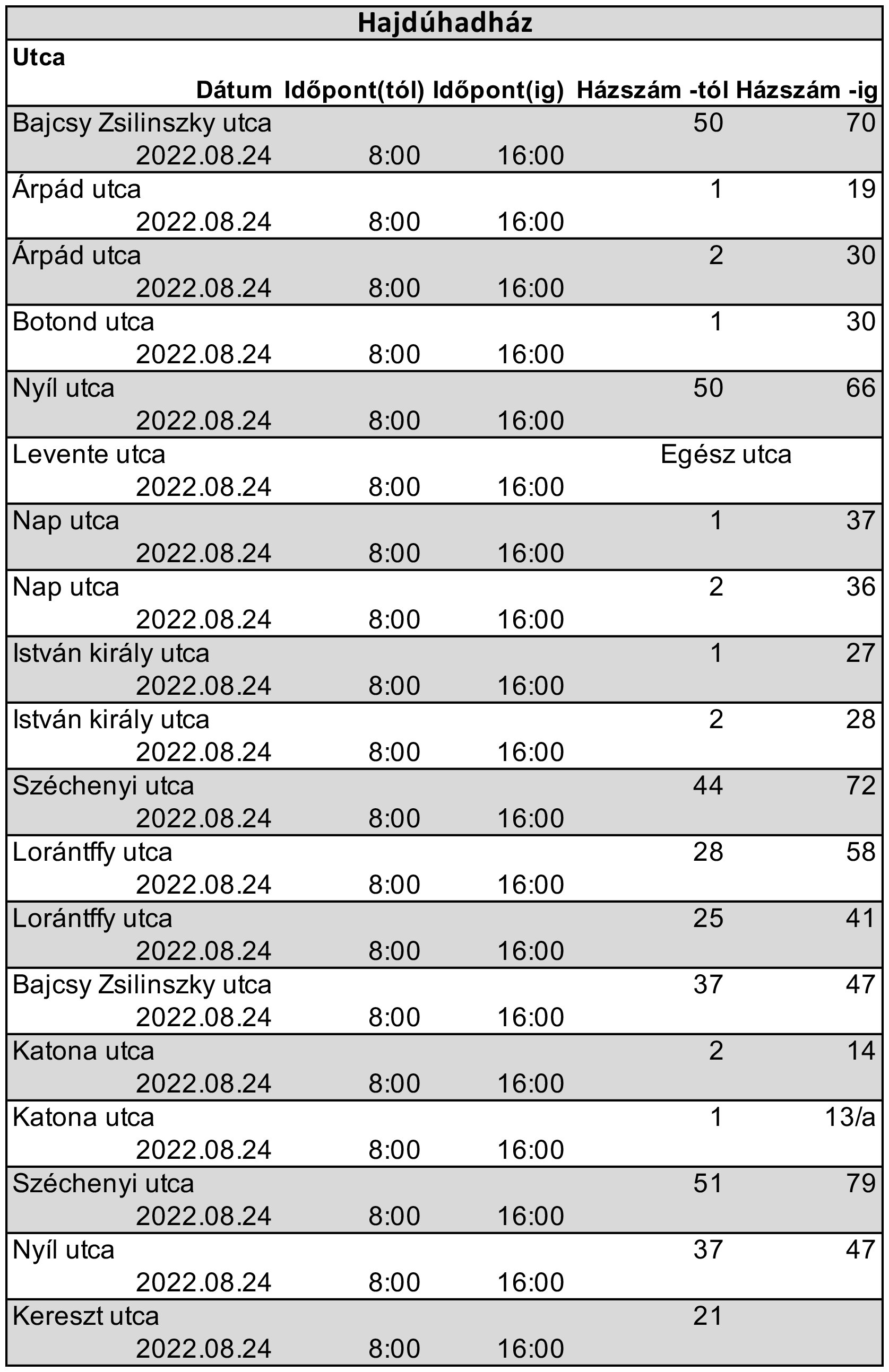 Az E.ON Ügyfélszolgálati Kft. értesíti a Tisztelt lakosságot, hogy 2022. augusztus 24-én az alábbi táblázaton látható időpontokban és helyszíneken áramszünet várható. Megértésüket köszönjük! „Senior torna” MEGHÍVÓ
