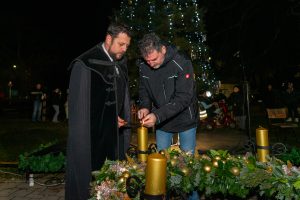 Asztalos Péter alpolgármester ünnepi köszöntője után Kovács Zoltán vezető lelkipásztor megáldotta városunk adventi koszorúját, majd meggyújtották rajta közösen az első gyertyát, a hitet jelképezőt.