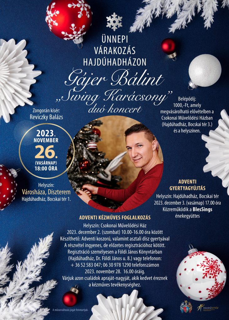 Gájer Bálint „Swing Karácsony” duó koncertjét 2023. november 26-án vasárnap 18.00 órakkor a Városháza Dísztermében tekinthetik meg az érdeklődők.