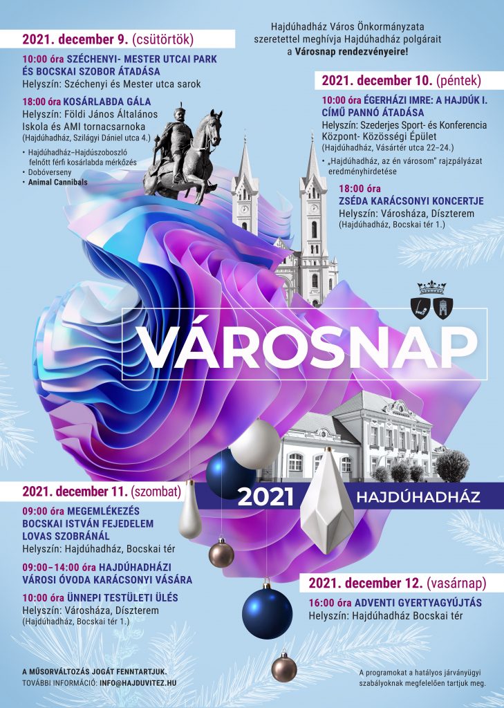 Hajdúhadház Város Önkormányzata idén is rengeteg programmal várja a lakosságot, érdeklődőket, amely minden korosztály igényét kiszolgálja. A Hajdúhadházi Lapokban már megjelent a programok ismertetője, amely annyiban változott, hogy december 11-én a Hajdúhadházi Népdalkör kiállítása, december 12-én pedig a Debreceni Helyőrség Zenekar Adventi Koncertje elmarad.