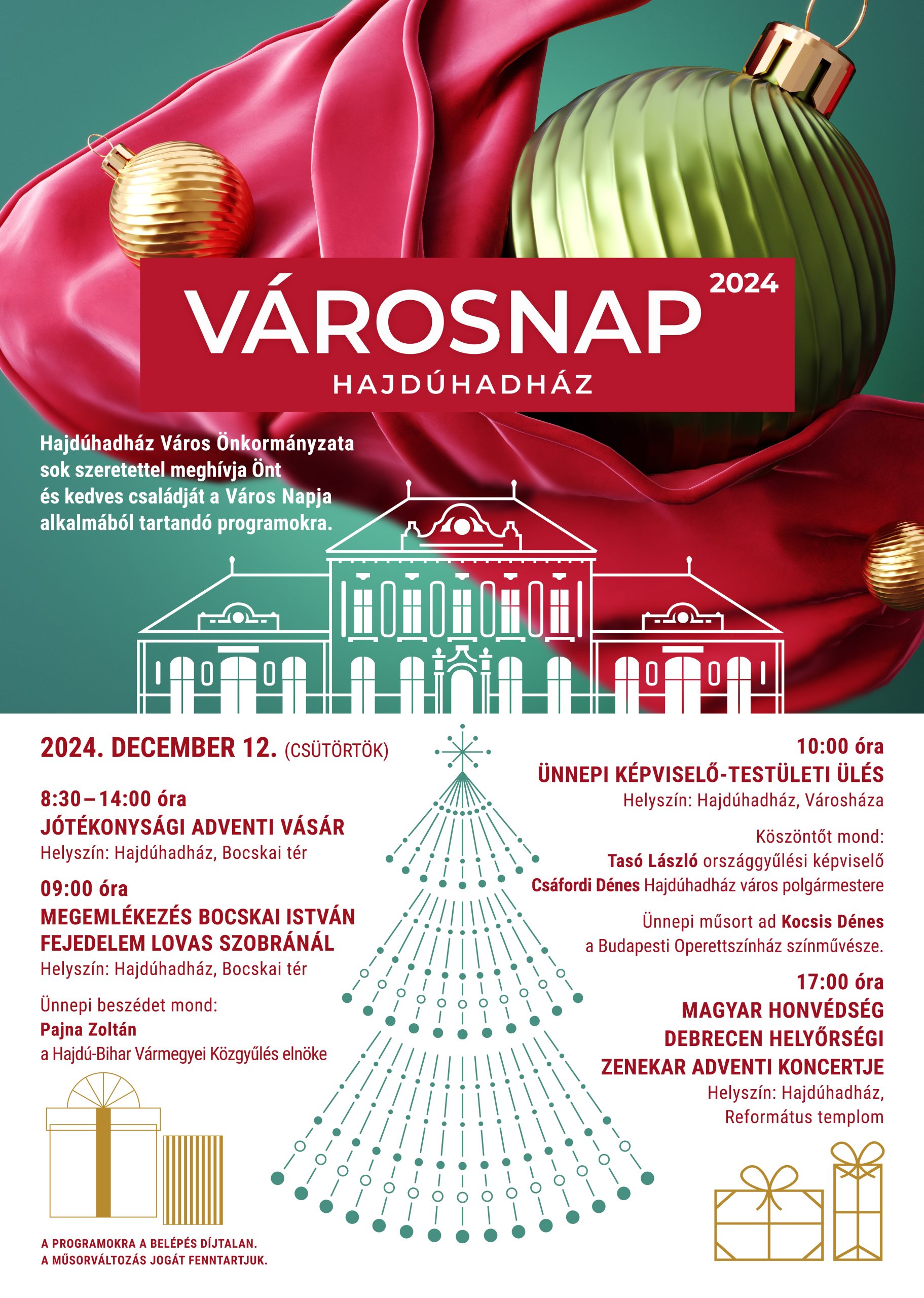 Szeretettel várunk mindenkit december 12-én a városnapi ünnepségünkre! Emlékezzünk meg együtt Hajdúhadház születésnapjáról! Hajdúhadházra is eljön a Mikulás! Figyeljünk egymásra az ünnepi időszakban!